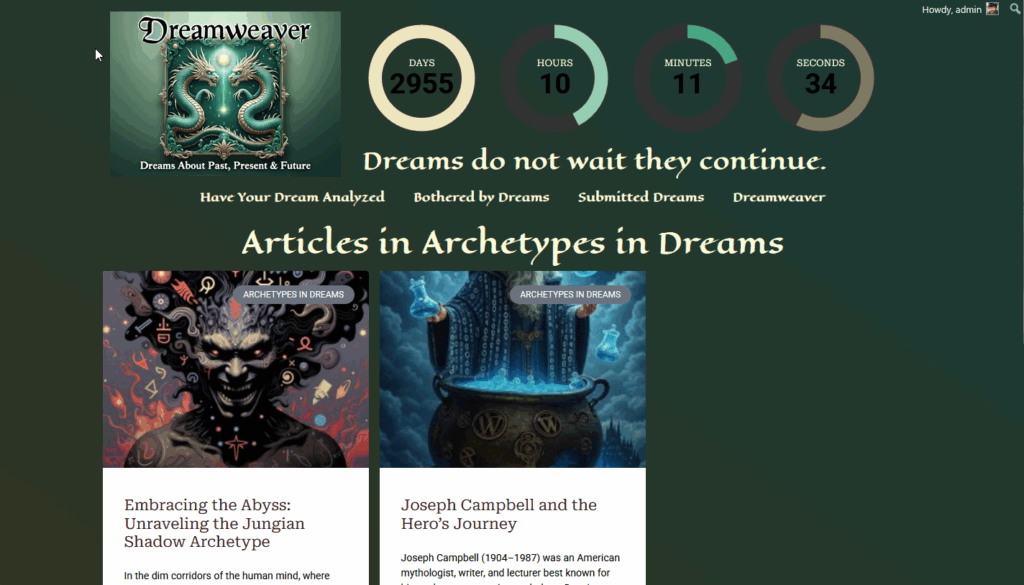 The homepage adopts a minimalist, hierarchical layout, featuring a simple navigation menu and a prominent “Other Articles” section that highlights recent posts. Key topics include Joseph Campbell's Hero’s Journey applied to dream narratives, soul-awakening techniques inspired by Carl Jung, and foundational theories of dream analysis. This setup invites visitors to dive into bite-sized explorations, with relative links guiding them deeper into the site's archives.
